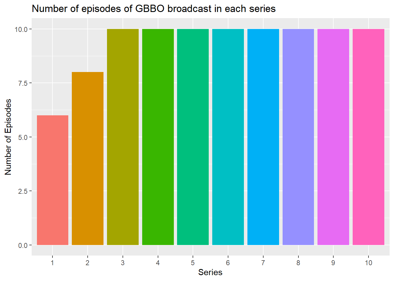 - Copy and edit the code above to produce a bar plot showing the number of episodes in each series of GBBO