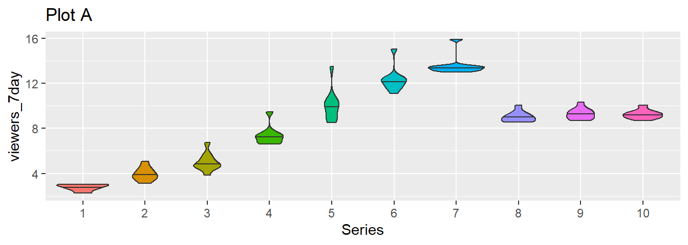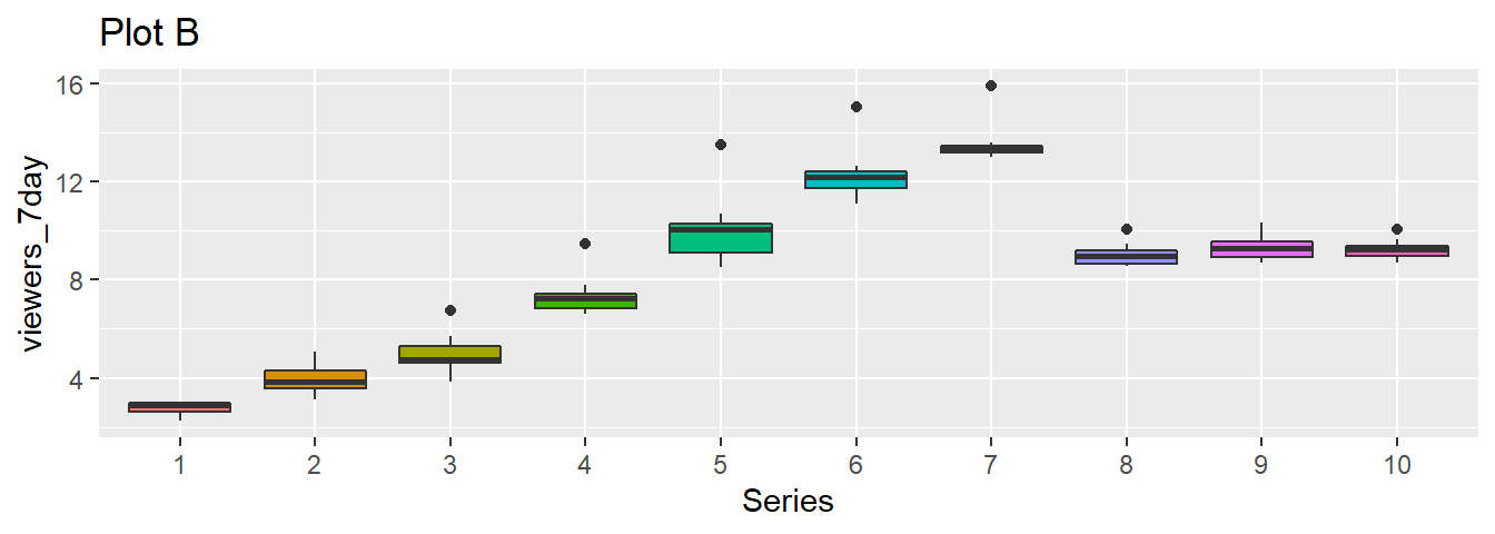 These plots show each individual episodes' ratings and are perhaps more detailed than we need. If we were just interested in looking at the ratings across series, then we could create summaries for each series and plot these.