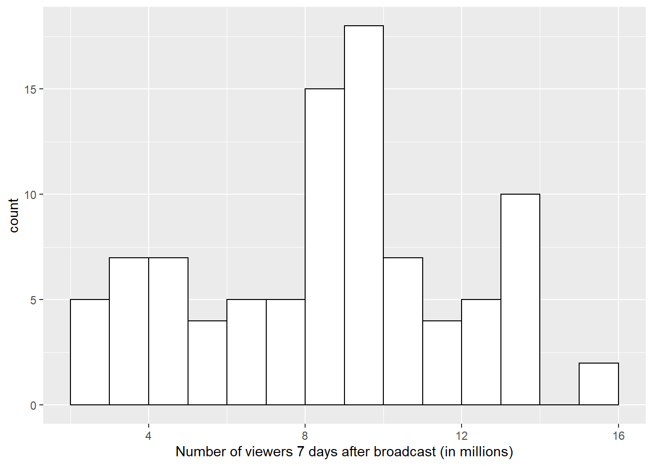 scale_x_continuous(name = "Number of viewers 7 days after broadcast (in millions)")ggplot(ratings, aes(x = viewers_7day)) +