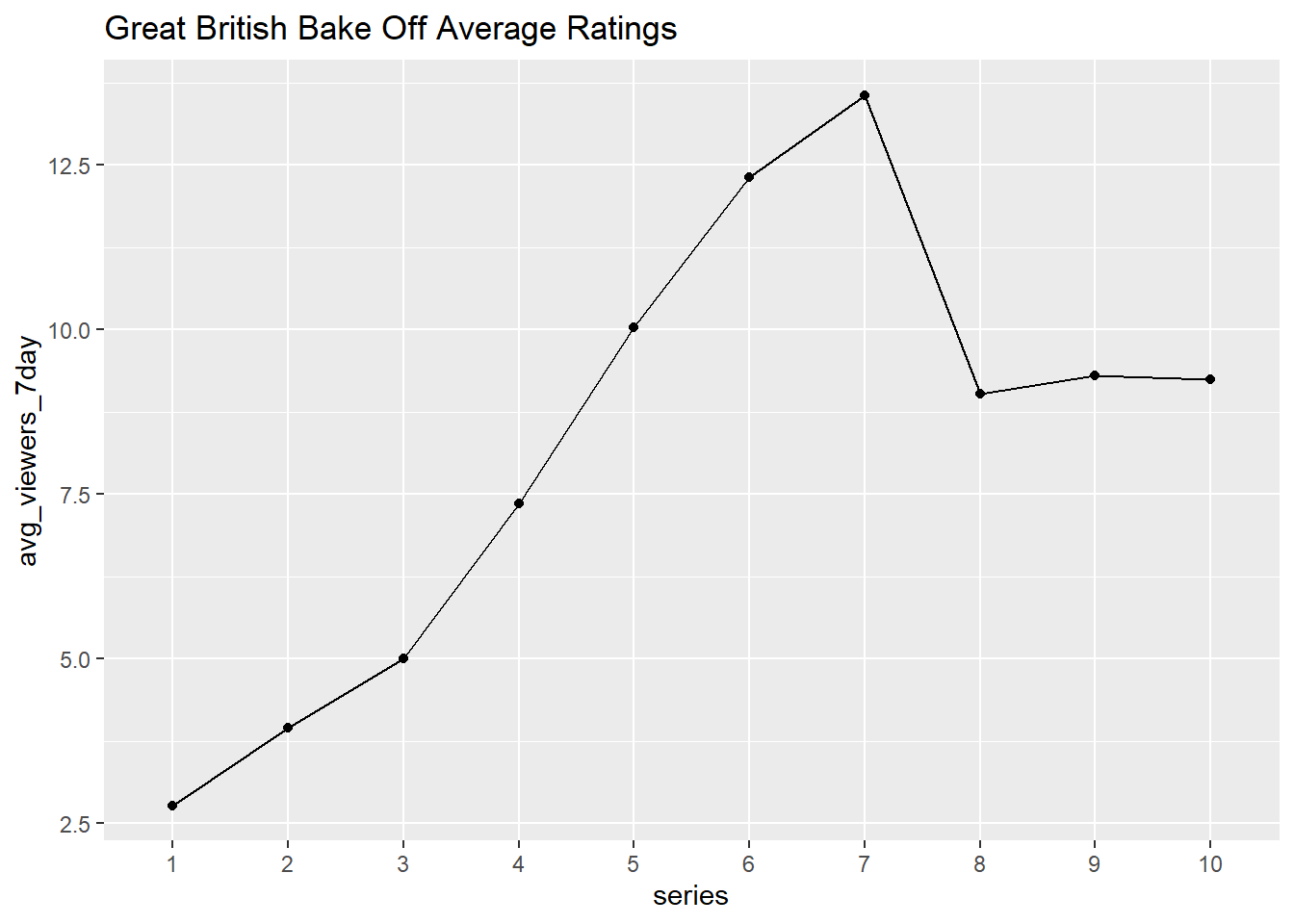 ggplot(avg_ratings, aes(x = series, y = avg_viewers_7day, group=1)) +