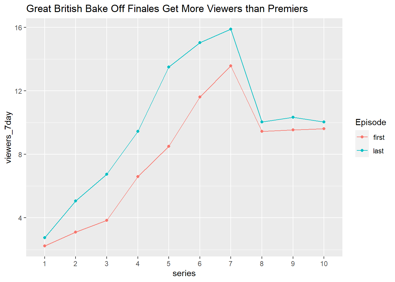 ggtitle("Great British Bake Off Finales Get More Viewers than Premiers") +
