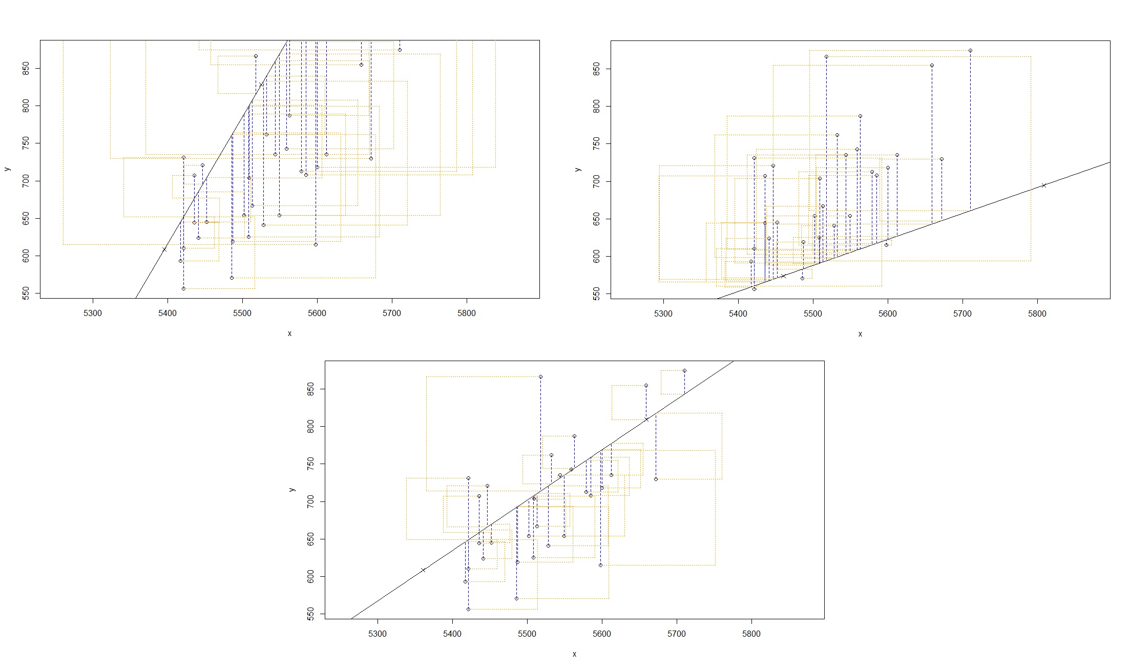 Orange Squares: This represents the square of each residual. As in literally the area of each orange circle \(= e_i^2\).